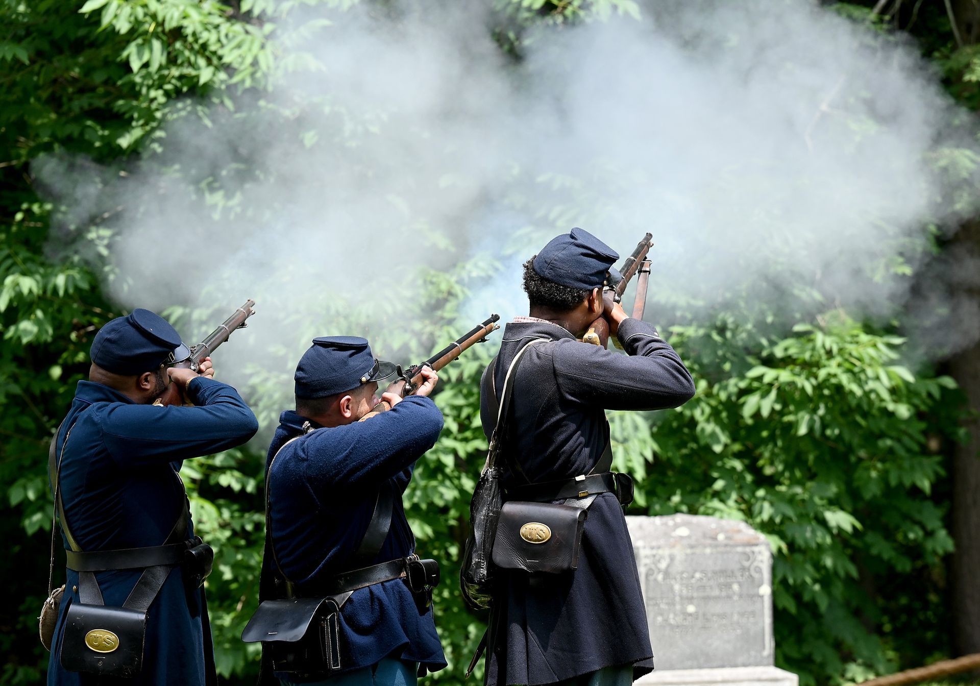 The Hannibal Guards, a living history group dedicated to telling the story of Black veterans of the Civil War, fires a musket salute during a ceremony honoring George Washington Dugan, a Concord farmer who gave his life during the Civil War while serving in the all-Black Massachusetts 54th Volunteer Infantry Regiment, at Sleepy Hollow cemetery on Saturday, July 15, 2023. The regiment was memorialized in the 1989 film, “Glory.” Ken McGagh for The Concord Bridge