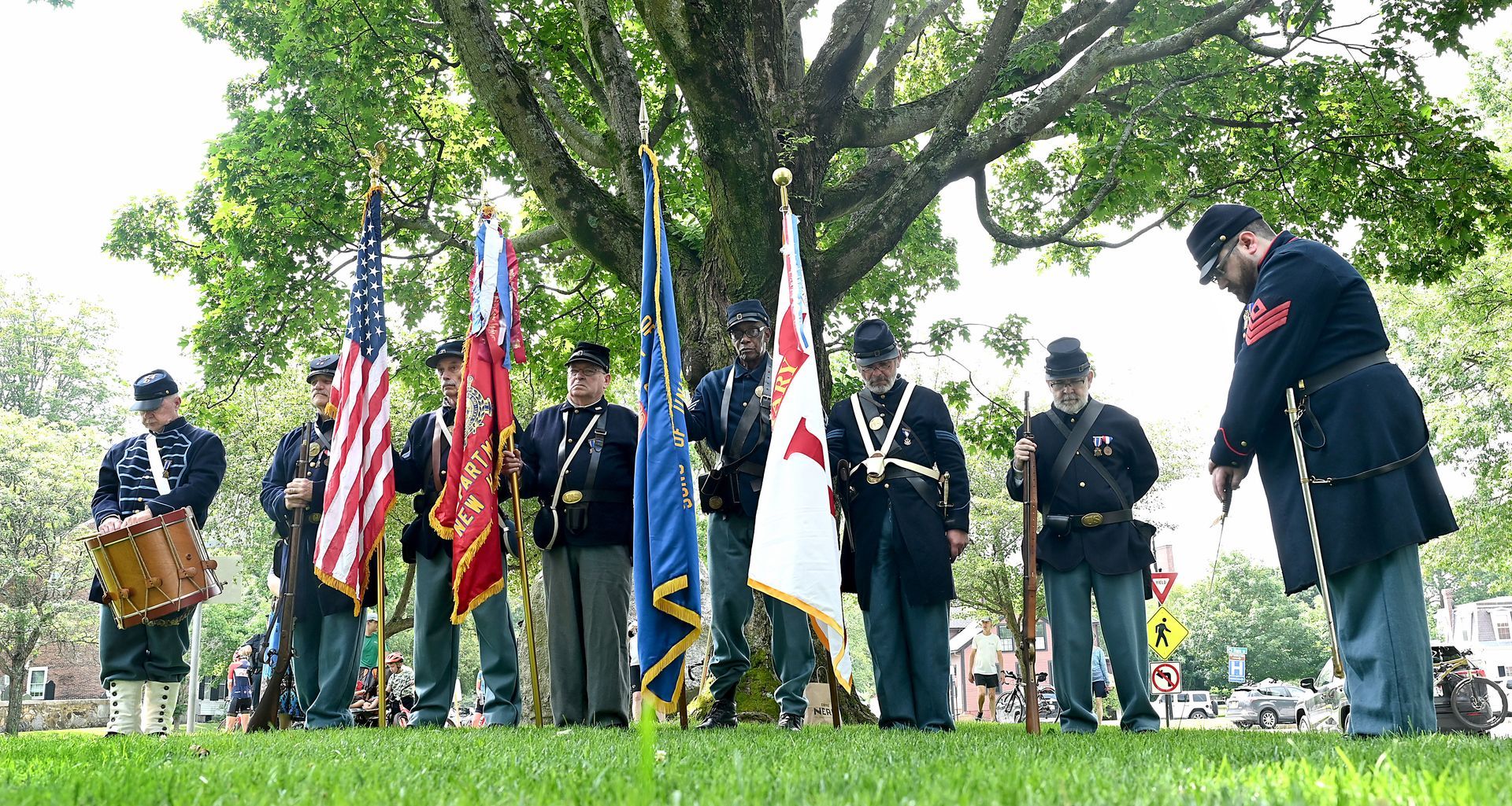 The Sons of Union Veterans of the Civil War bow their heads in prayer during a ceremony honoring George Washington Dugan, a Concord farmer who gave his life during the Civil War while serving in the all-Black Massachusetts 54th Volunteer Infantry Regiment at Monument Square, Saturday, July 15, 2023. Pvt. Dugan was killed during the storming of Fort Wagner, South Carolina, in 1863. Ken McGagh for The Concord Bridge