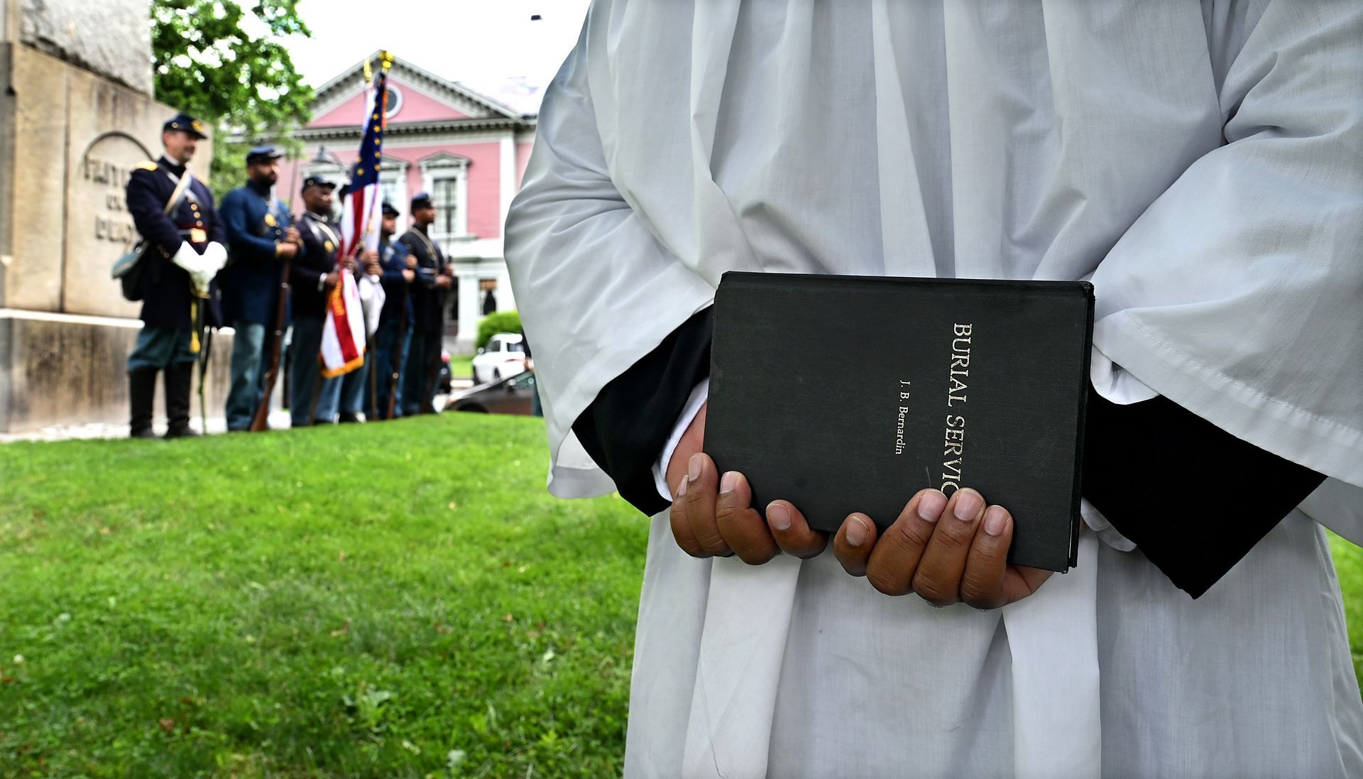 Rev. James Hairston holds the burial service book he will read from during a ceremony honoring George Washington Dugan, a Concord farmer who gave his life during the Civil War while serving in the all-Black Massachusetts 54th Volunteer Infantry Regiment at Monument Square, Saturday, July 15, 2023. After the ceremony, Pvt. Dugan was buried with full military honors at Sleepy Hollow Cemetery. Ken McGagh for The Concord Bridge