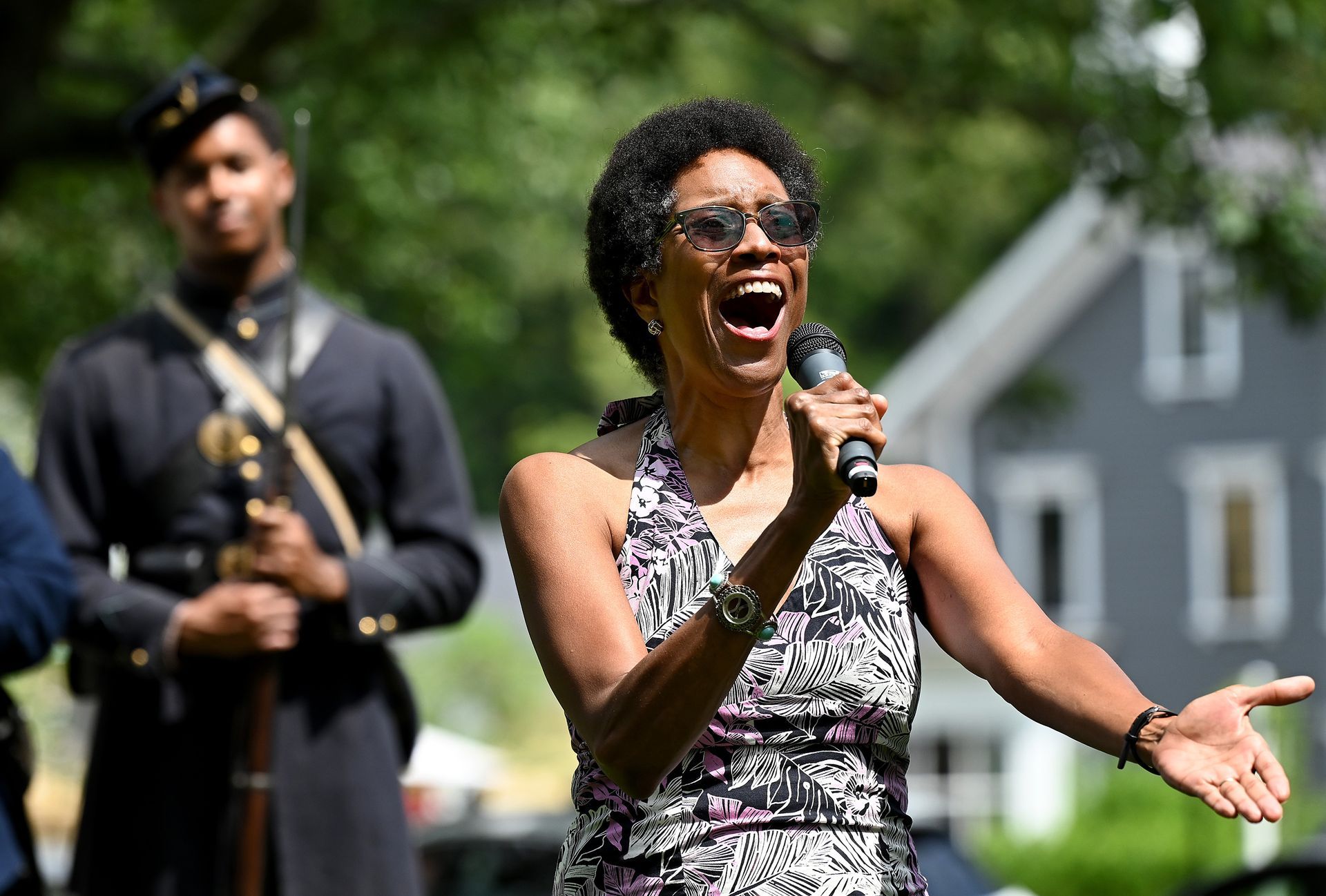 Soloist Merle Perkins sings “Oh, Freedom” during a ceremony honoring George Washington Dugan, a Concord farmer who gave his life during the Civil War while serving in the all-Black Massachusetts 54th Volunteer Infantry Regiment at Monument Square, Saturday, July 15, 2023. Ken McGagh for The Concord Bridge