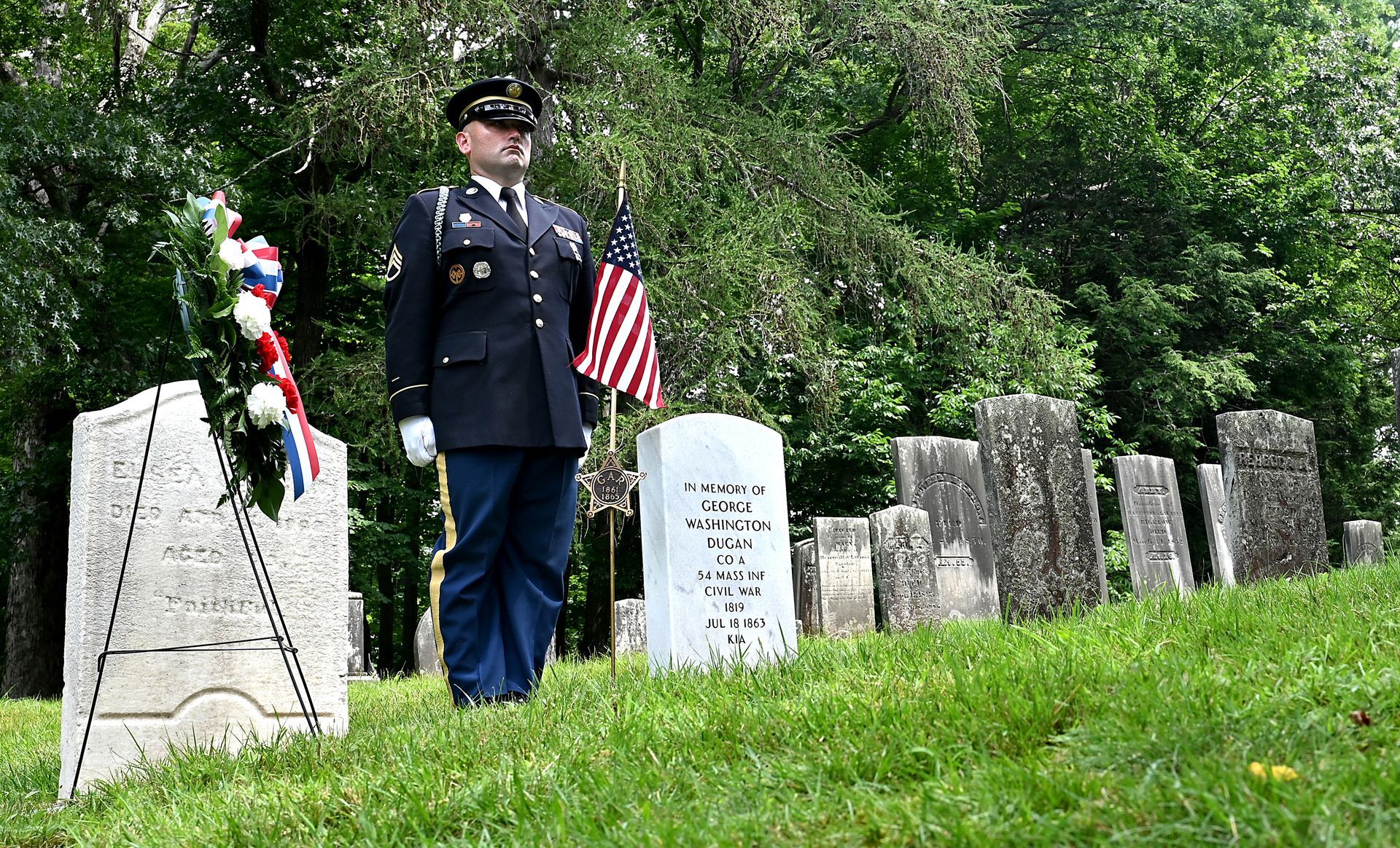 A Massachusetts National Guard honor guard member stands at attention at the grave of Pvt. George Washington Dugan of Concord at the conclusion of a dedication ceremony for the veteran of the Civil War era all-Black Massachusetts 54th Volunteer Infantry Regiment, at Sleepy Hollow Cemetery on Saturday, July 15, 2023. Ken McGagh for The Concord Bridge