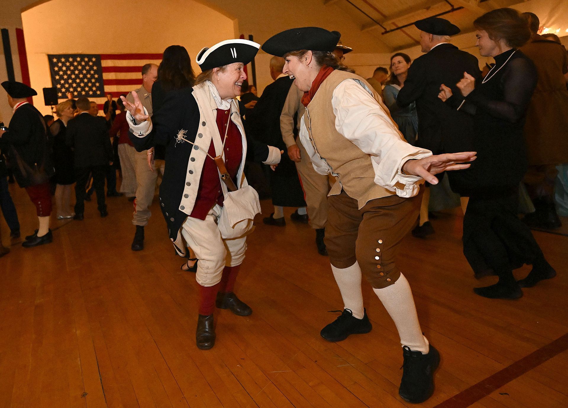 Roseanne Swain, left, and Mary Jean Laviolette of the Concord Minutemen Fife and Drum Corps party likes its 1775 as they dance to the music of the Love Dogs during the 2025 Patriots’ Ball at the Concord Armory on Saturday, April 12, 2025. Decades ago, the ball was an integral part of Patriots’ Day celebrations. The party made a comeback in 2025 in honor of the 250th anniversary of the start of the American Revolution.