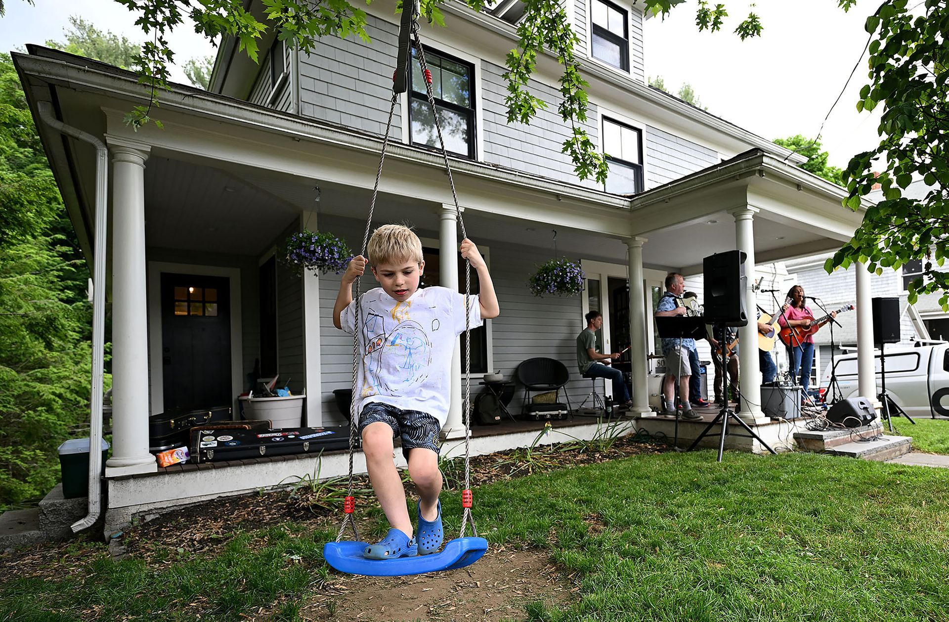 Elliot Cooley, 6, plays on his swing while the band The Anna and Mickey Show perform from his Highland Street porch during the West Concord Porchfest, Saturday, June 8, 2024. The all-ages grassroots community music festival is in its fourth year. Ken McGagh for The Concord Bridge